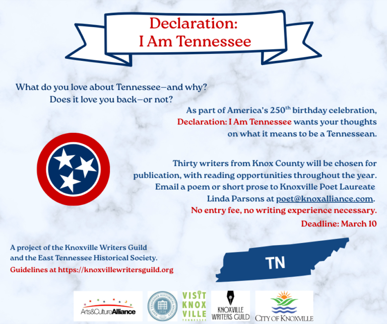 The Knoxville Writers Guild is accepting submissions during February for its annual poetry contest. Submissions open February 1, 2026, and must be received electronically by 11:59 p.m. on February 28, 2026. First prize is $300 and second prize is $100. The first prize winner will be offered an opportunity to read their winning poem at a future KWG meeting. Guild members are entitled to one free submission.